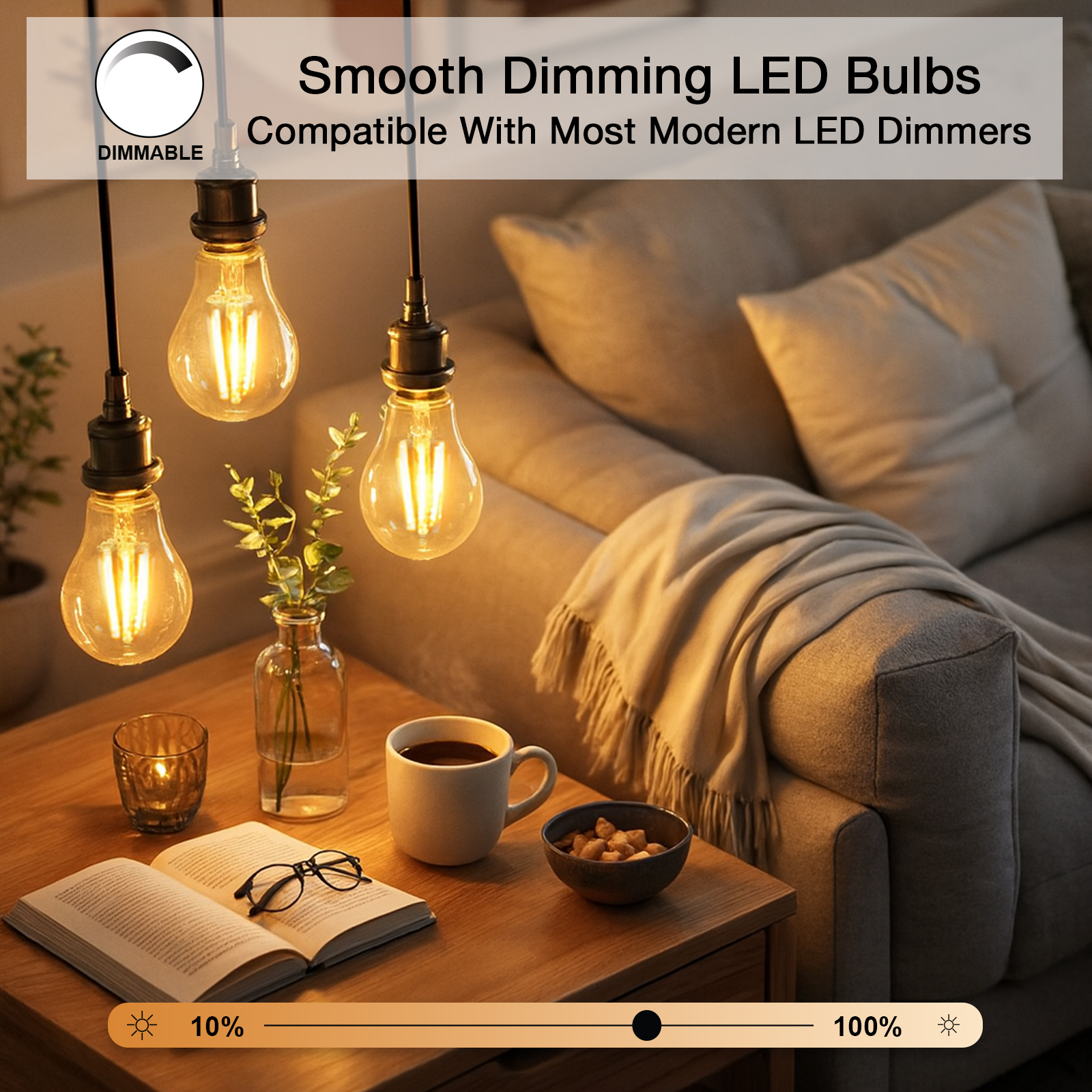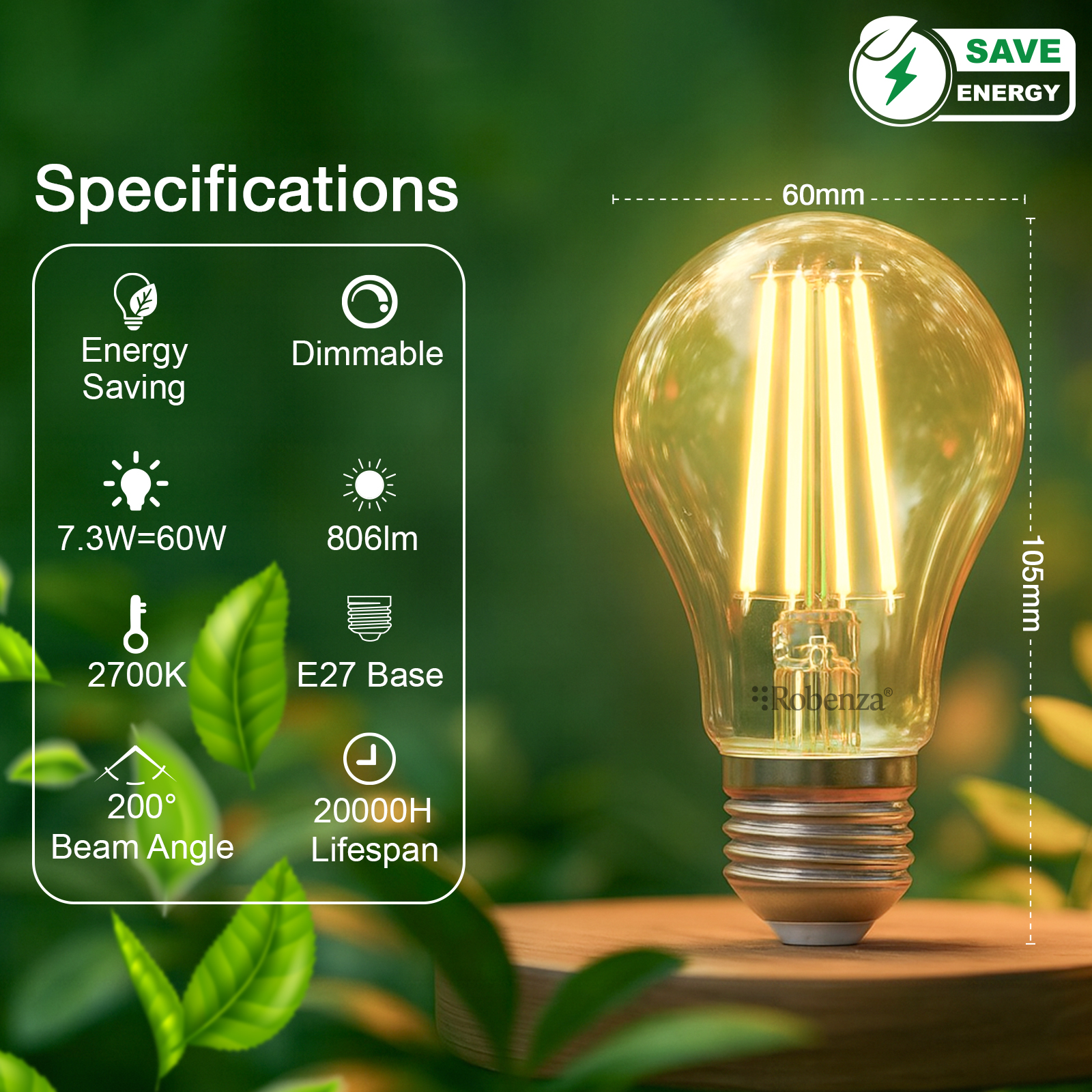 Filament GLS Dimmable Bulbs, E27, 7.3W=60w, 806LM, 2700K
