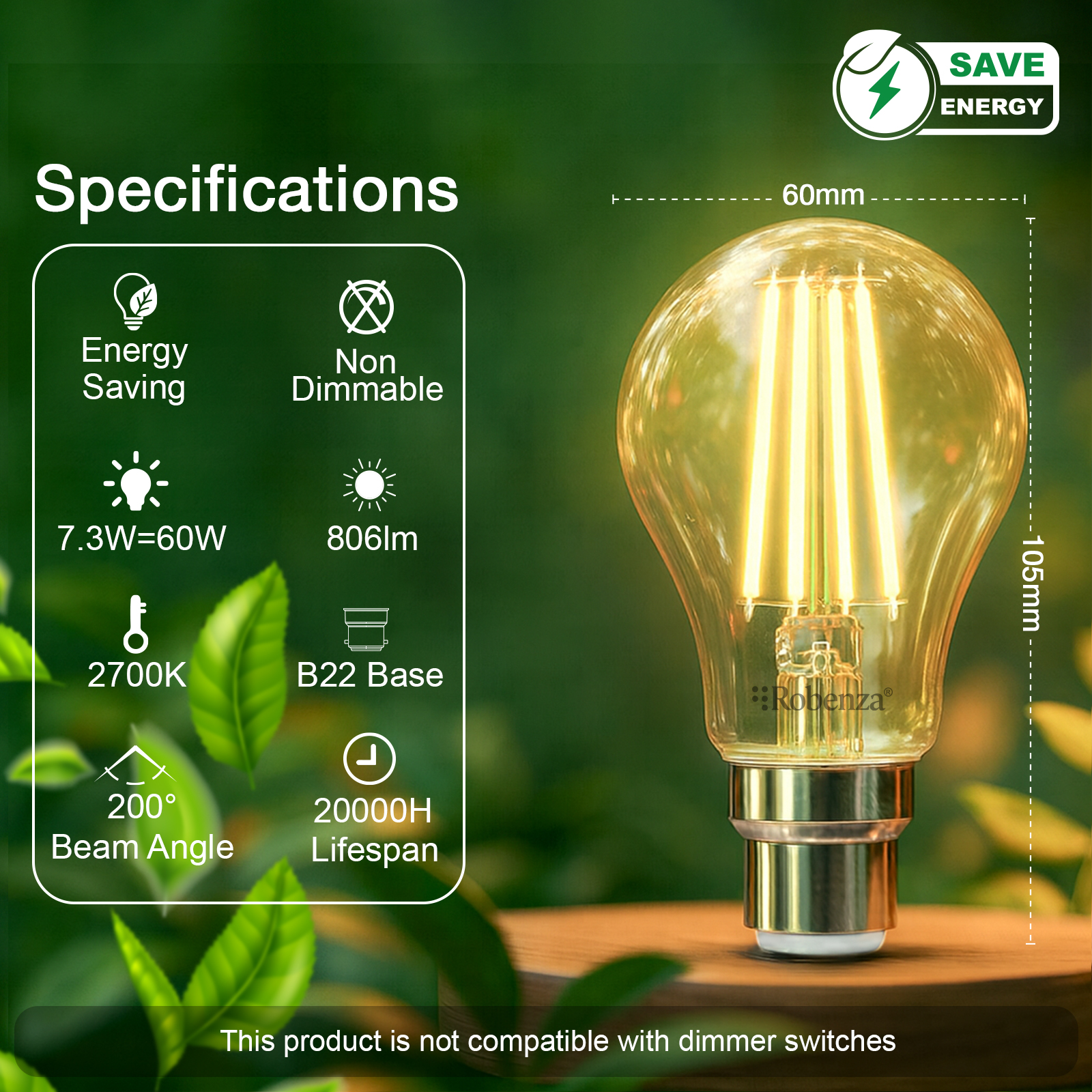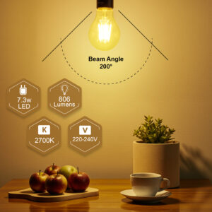 Filament GLS Non-Dimmable Bulbs, B22, 7.3W=60w, 806LM, 2700K
