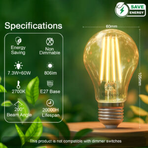 Filament GLS Non-Dimmable Bulbs, E27, 7.3W=60w, 806LM, 2700K