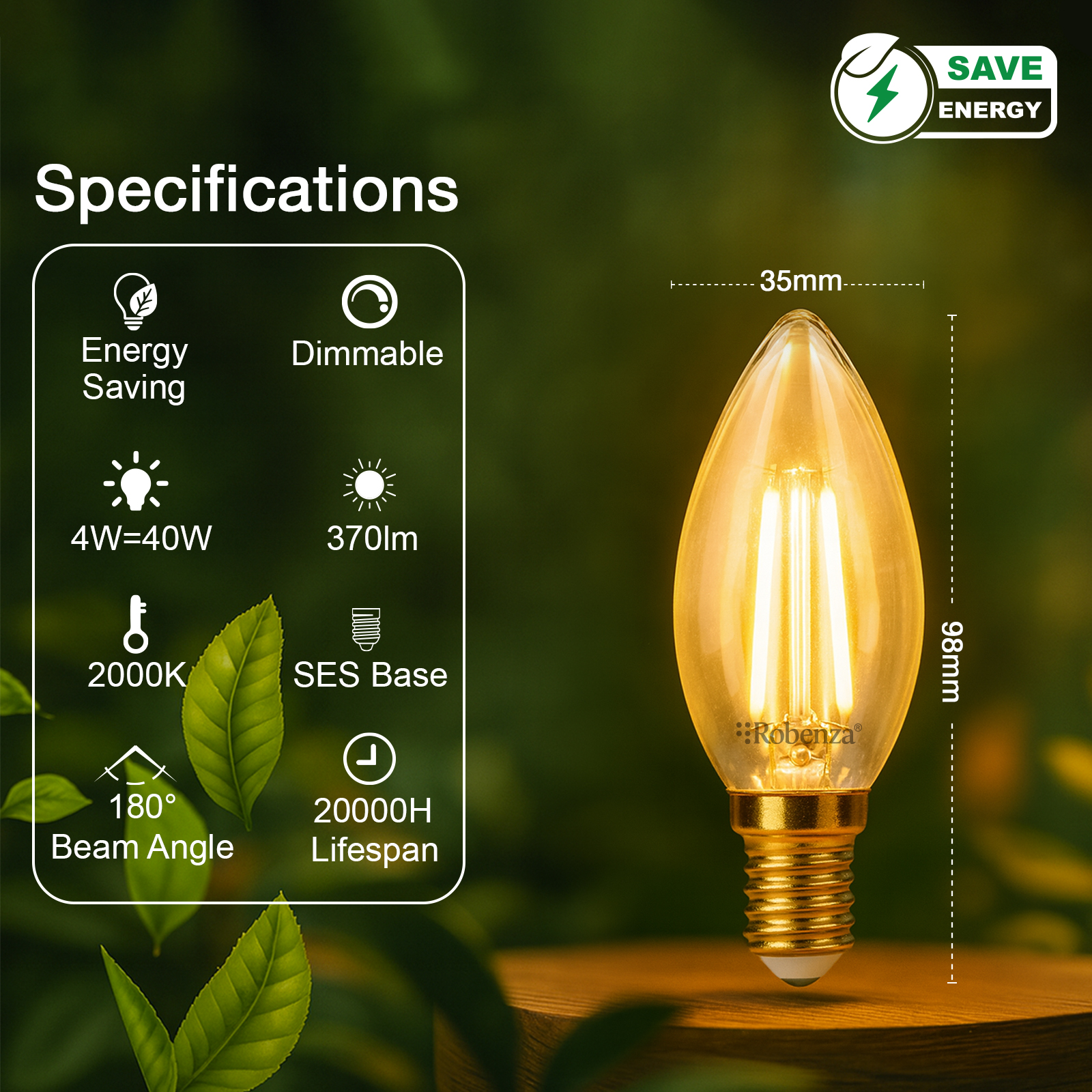 LED Filament Candle Dimmable Bulbs, E14, 4W=40w, 370LM, 2000K