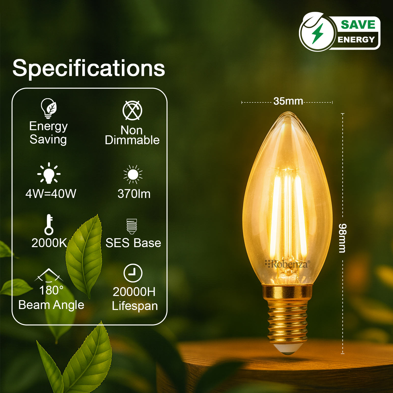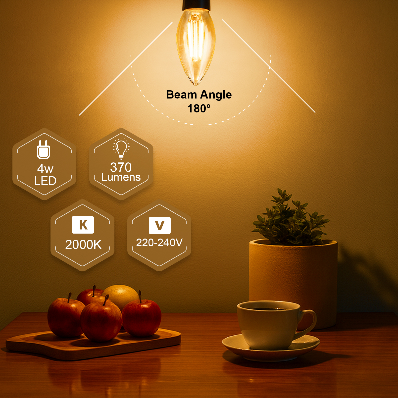 LED Filament Candle Non-Dimmable Bulbs, E14, 4W=40w, 370LM, 2000K