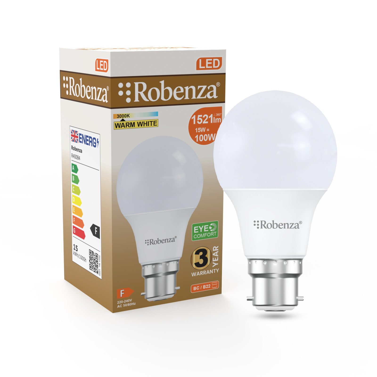 LED GLS Non-Dimmable Bulbs, B22, 15W=100w, 1521LM, 3000K